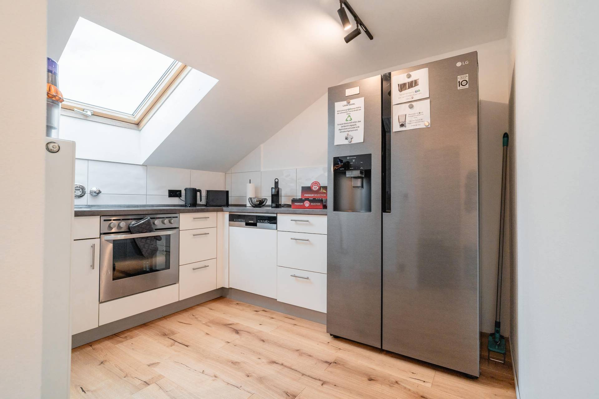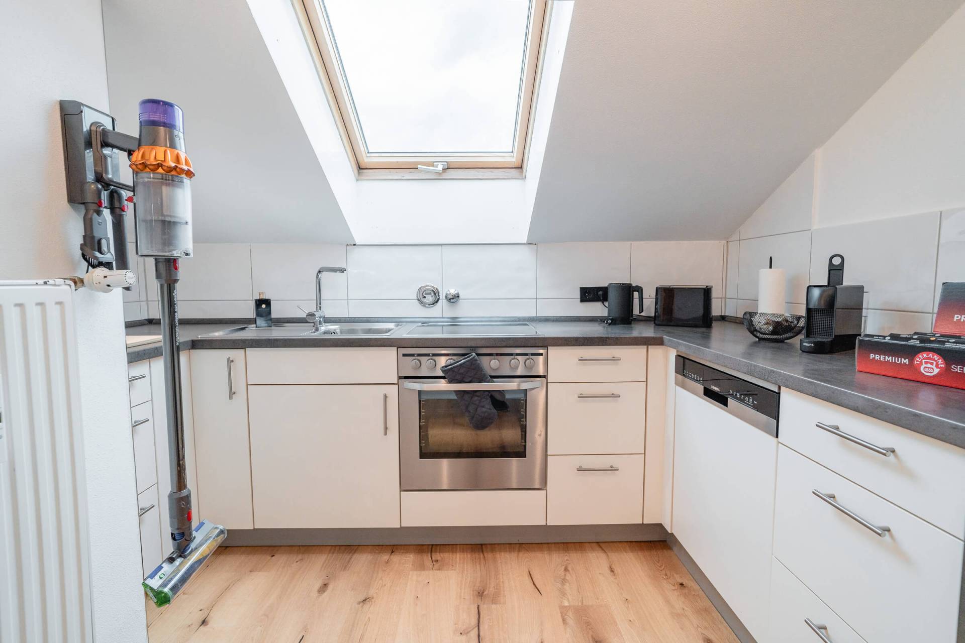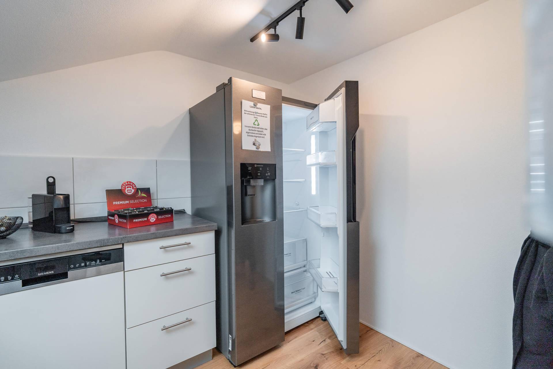 Die moderne Einbauküche ist vollständig ausgestattet und fügt sich mit ihrem klaren Design nahtlos in den Raum ein. Hochwertige Materialien und ein durchdachtes Raumkonzept machen diese Unterkunft zu einem besonderen Ort.