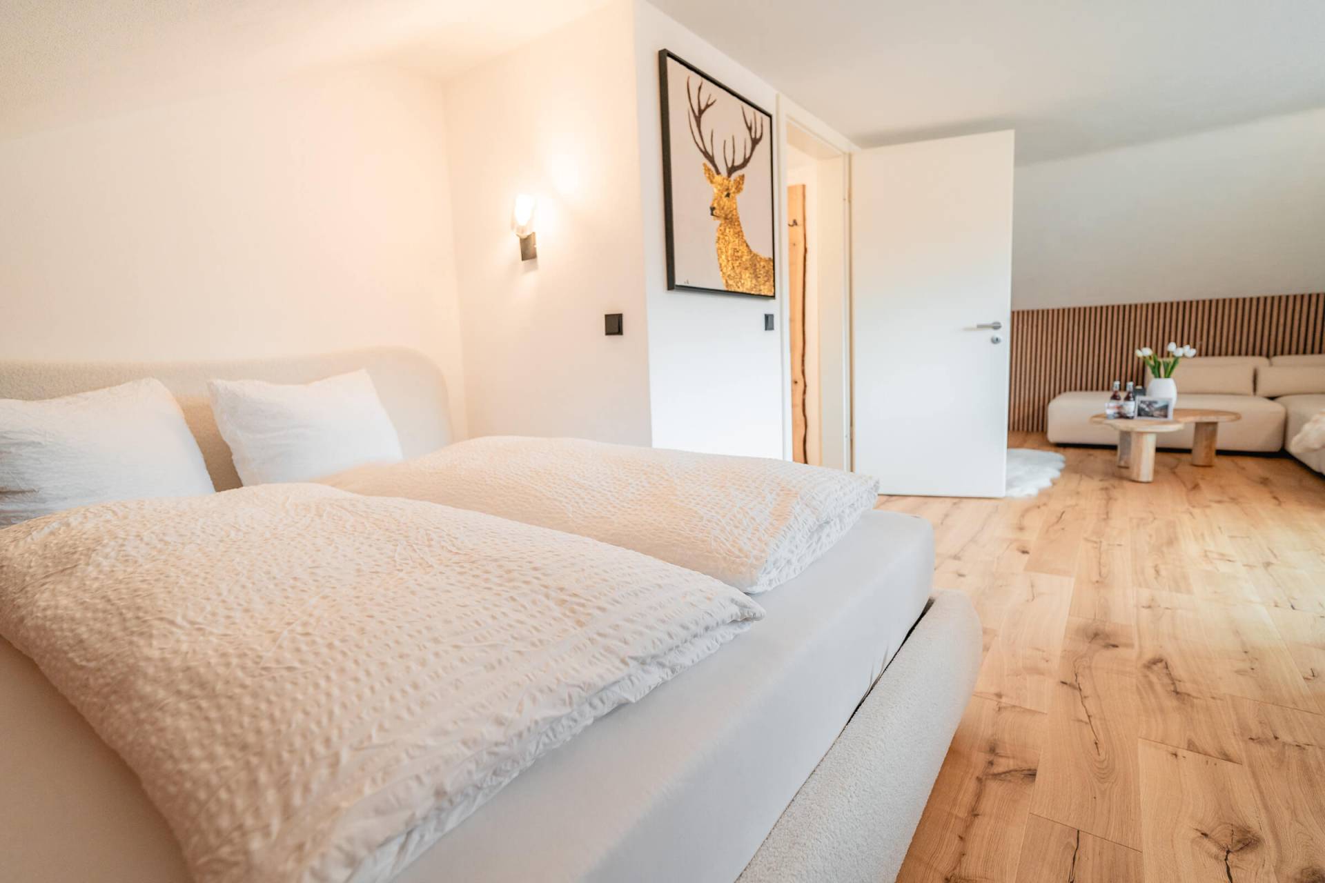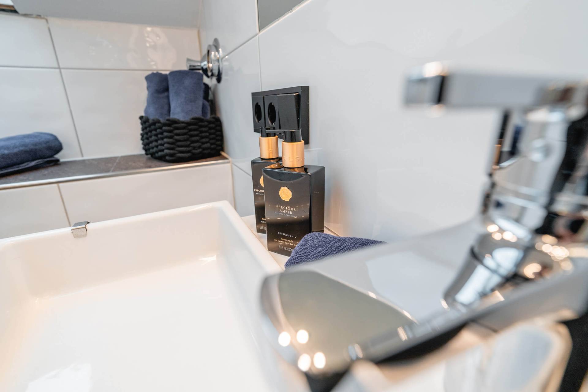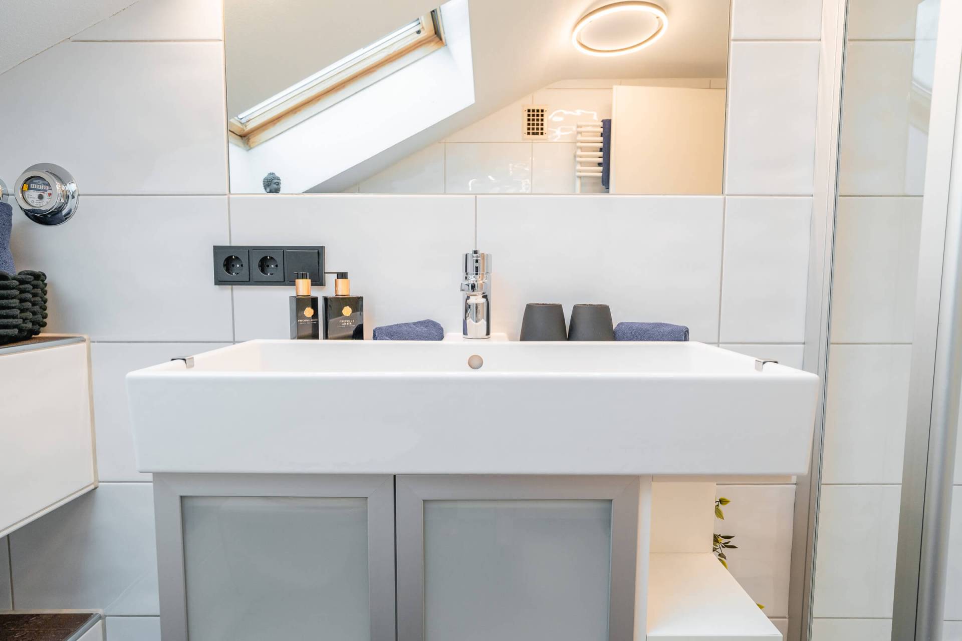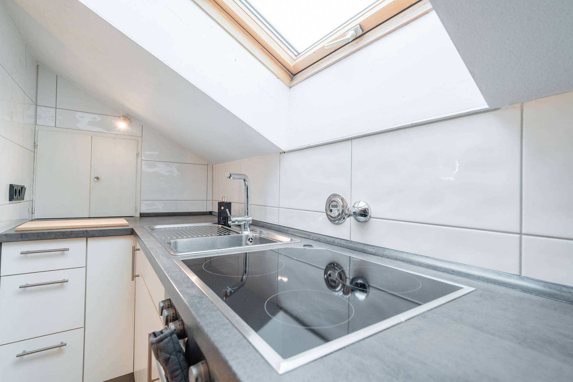 Die moderne Einbauküche ist vollständig ausgestattet und fügt sich mit ihrem klaren Design nahtlos in den Raum ein. Hochwertige Materialien und ein durchdachtes Raumkonzept machen diese Unterkunft zu einem besonderen Ort.