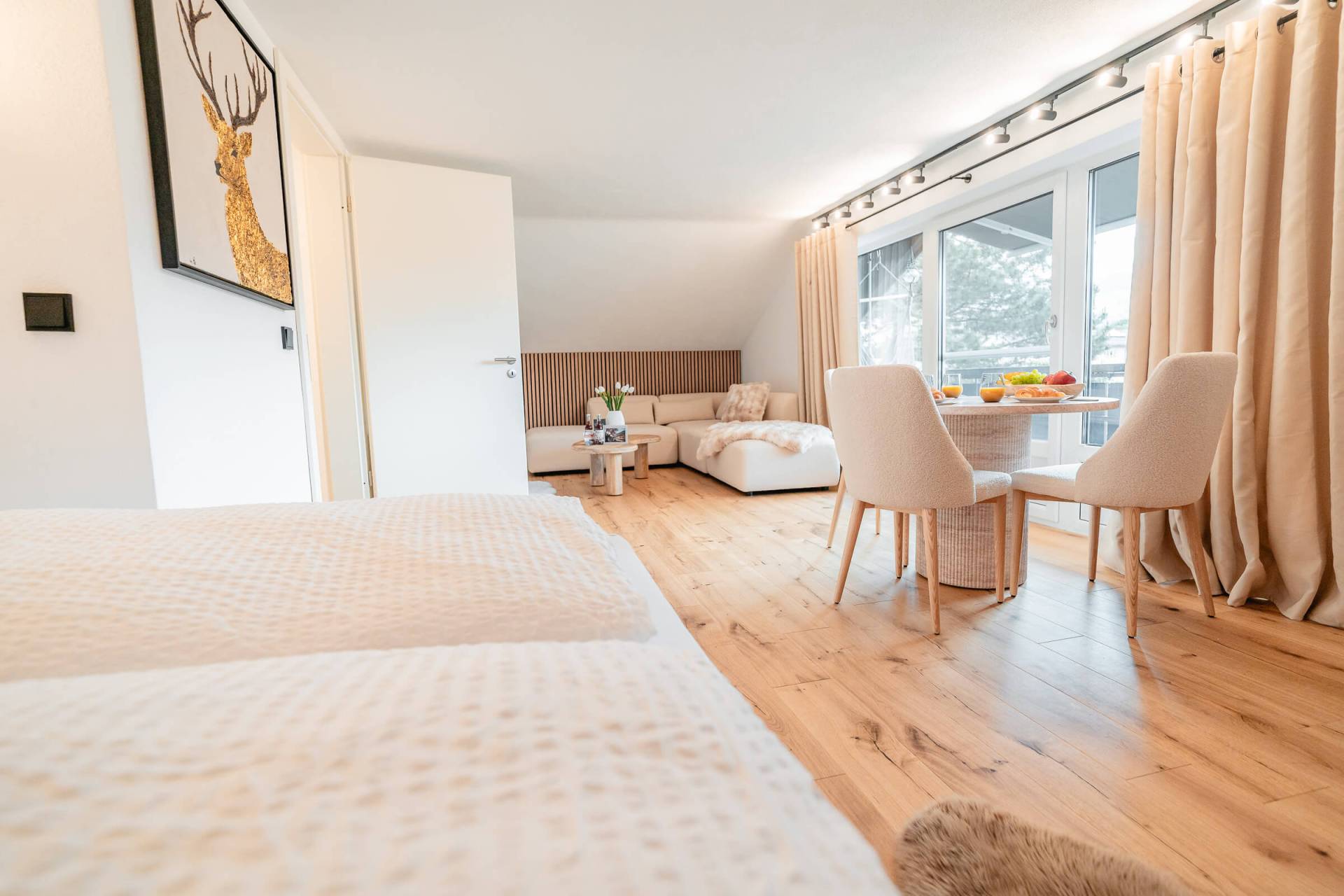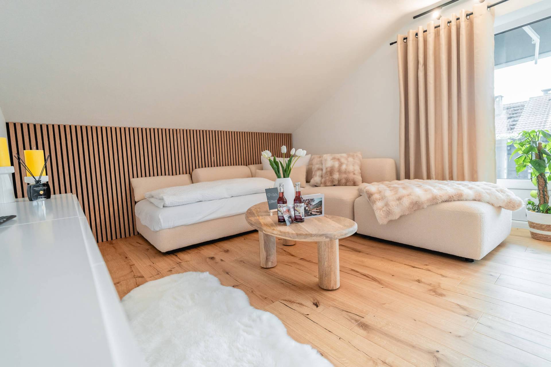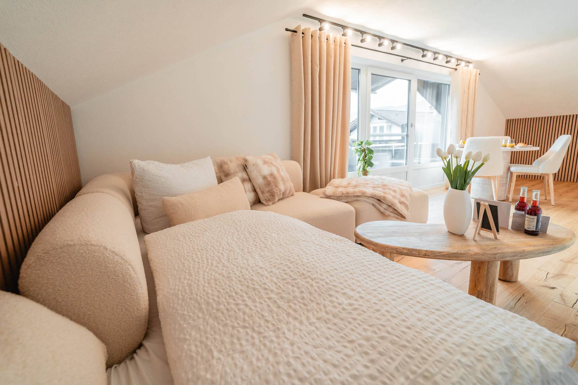 Willkommen in dieser liebevoll modernisierten Dachgeschosswohnung – ein stilvoller Rückzugsort mit hochwertigem Echtholzboden, der Wärme und Eleganz ausstrahlt. Die Einrichtung ist modern, hell und in harmonischen Beige- und Naturtönen gehalten, was der Wohnung eine ruhige, entspannte Atmosphäre verleiht.
