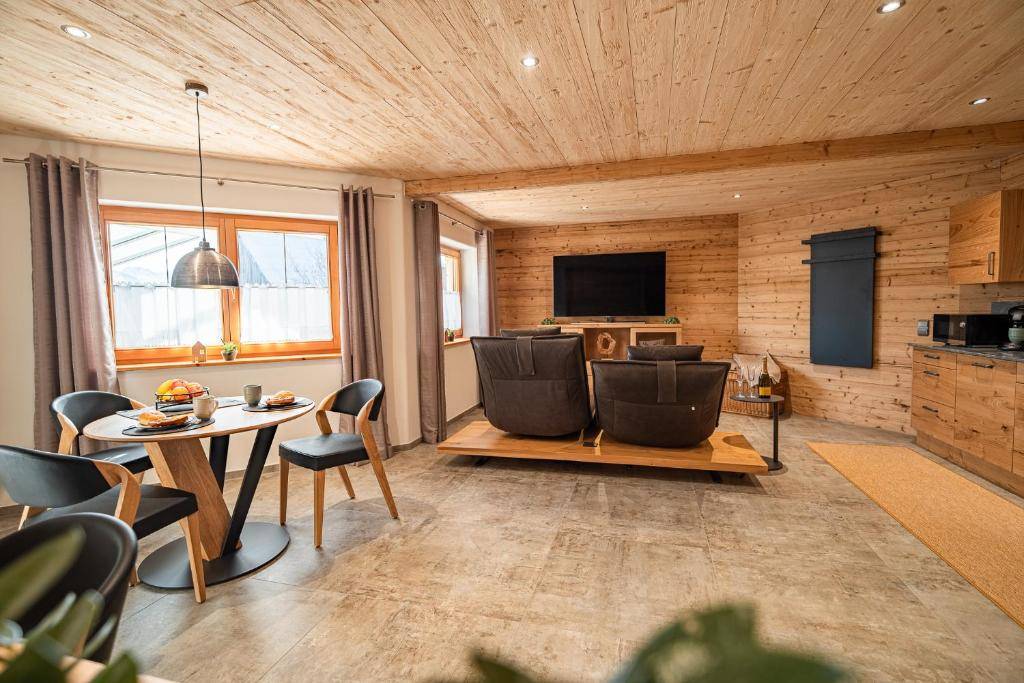 Dieses charmante Chalet vereint modernen Wohnkomfort mit traditionellem alpinen Flair. Liebevoll ausgestattet mit hochwertigem Zirbenholz und natürlichen Materialien, bietet die Wohnung eine besonders behagliche Atmosphäre. Der großzügige Wohn- und Essbereich mit offener Küche ist lichtdurchflutet und lädt mit stilvollen Holzmöbeln und einer gemütlichen Sofaecke zum Verweilen ein. Vom Esstisch aus genießen Sie einen traumhaften Blick auf die umliegenden Berge.